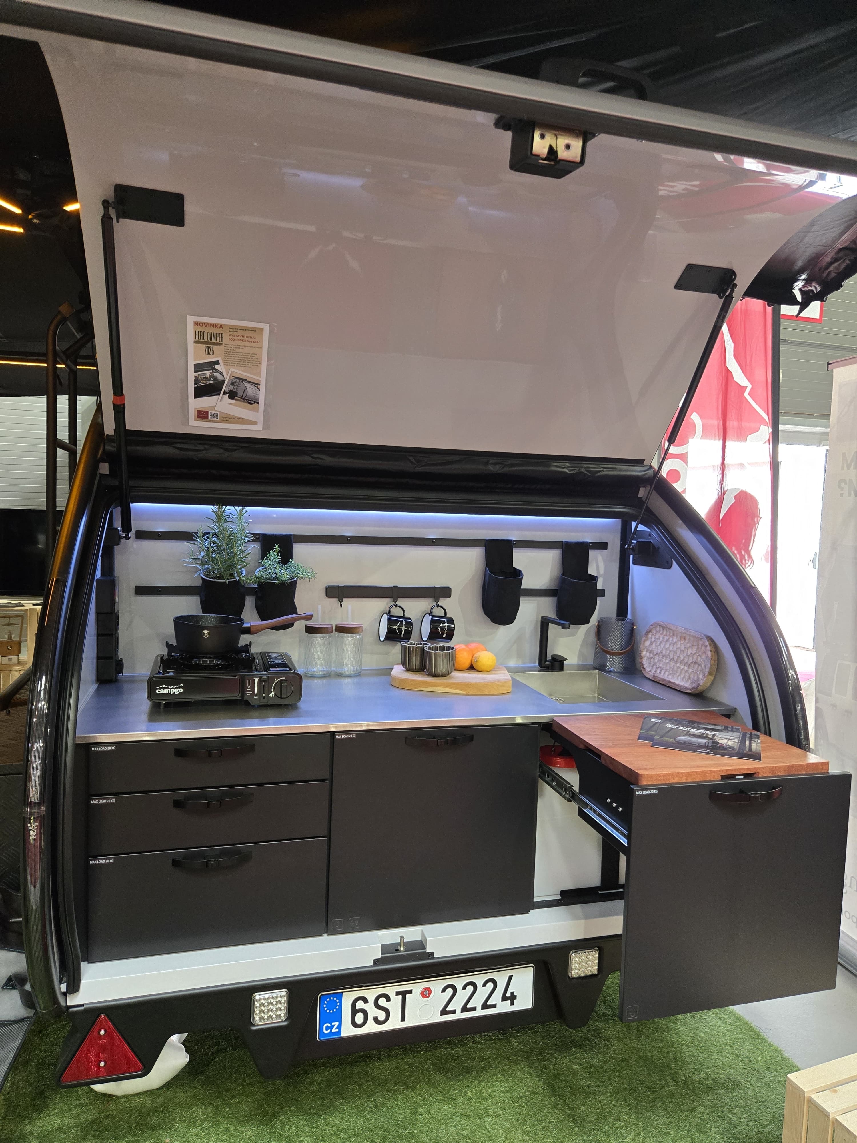 Hero Camper má v zadní části plnohodnotnou kuchyni obsahující nerezovou desku, dřez s odpadem, nádrž na vodu (48 l) připojenou k vodovodní baterii, prostor pro přenosnou lednici (35 l) a šuplíky na nádobí. K dispozici máte elektrické připojení na 5V/12V/230V a osvětlení LED páskem.